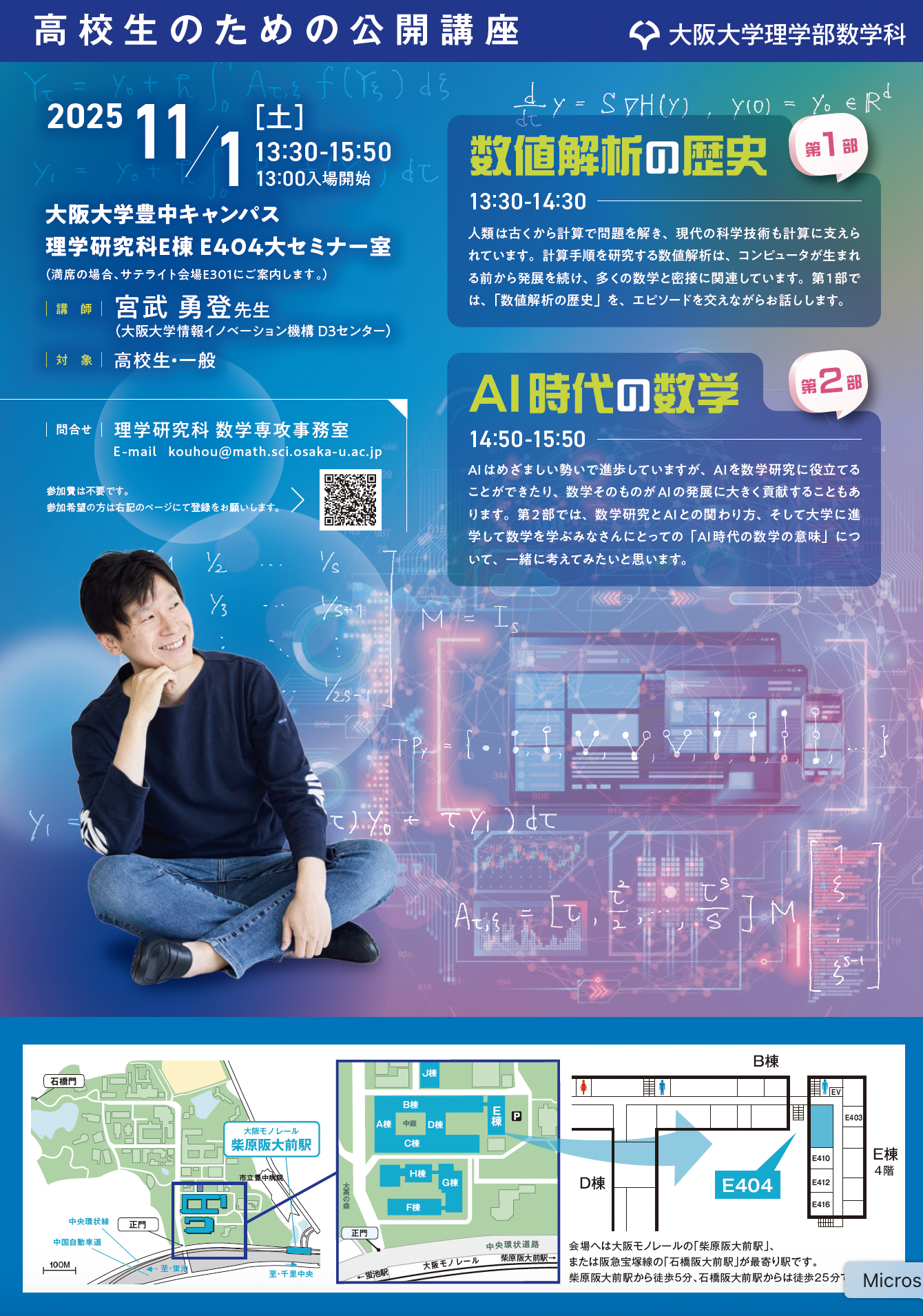 大阪大学理学部数学教室では、数学に興味を持つ若い皆さんのために、現代数学の様相と数学研究の実際、自然科学や社会科学に及ぼす数学の影響、文化としての数学の在り方などについて、多角的な視点から易しく解説する公開講座を以下の要領で開催します。