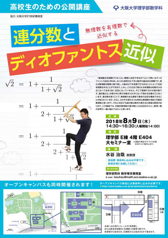 大阪大学理学部数学教室では、数学に興味を持つ若い皆さんのために、現代数学の様相と数学研究の実際、自然科学や社会科学に及ぼす数学の影響、文化としての数学の在り方などについて、多角的な視点から易しく解説する公開講座を以下の要領で開催します。受講料は無料で、事前申し込みも不要です。